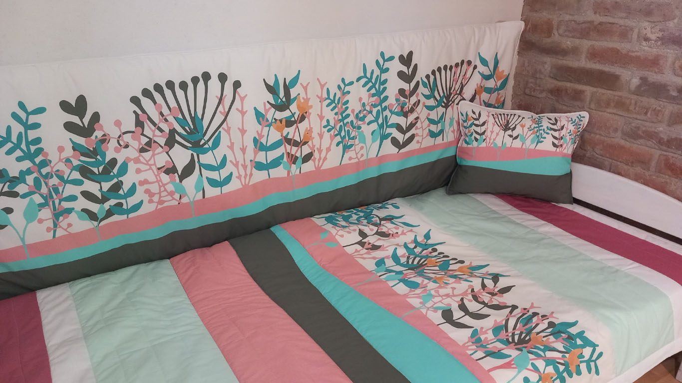 Finom tapintású, puha, bélelt falvédő, amihez télen-nyáron kellemes hozzádőlni.